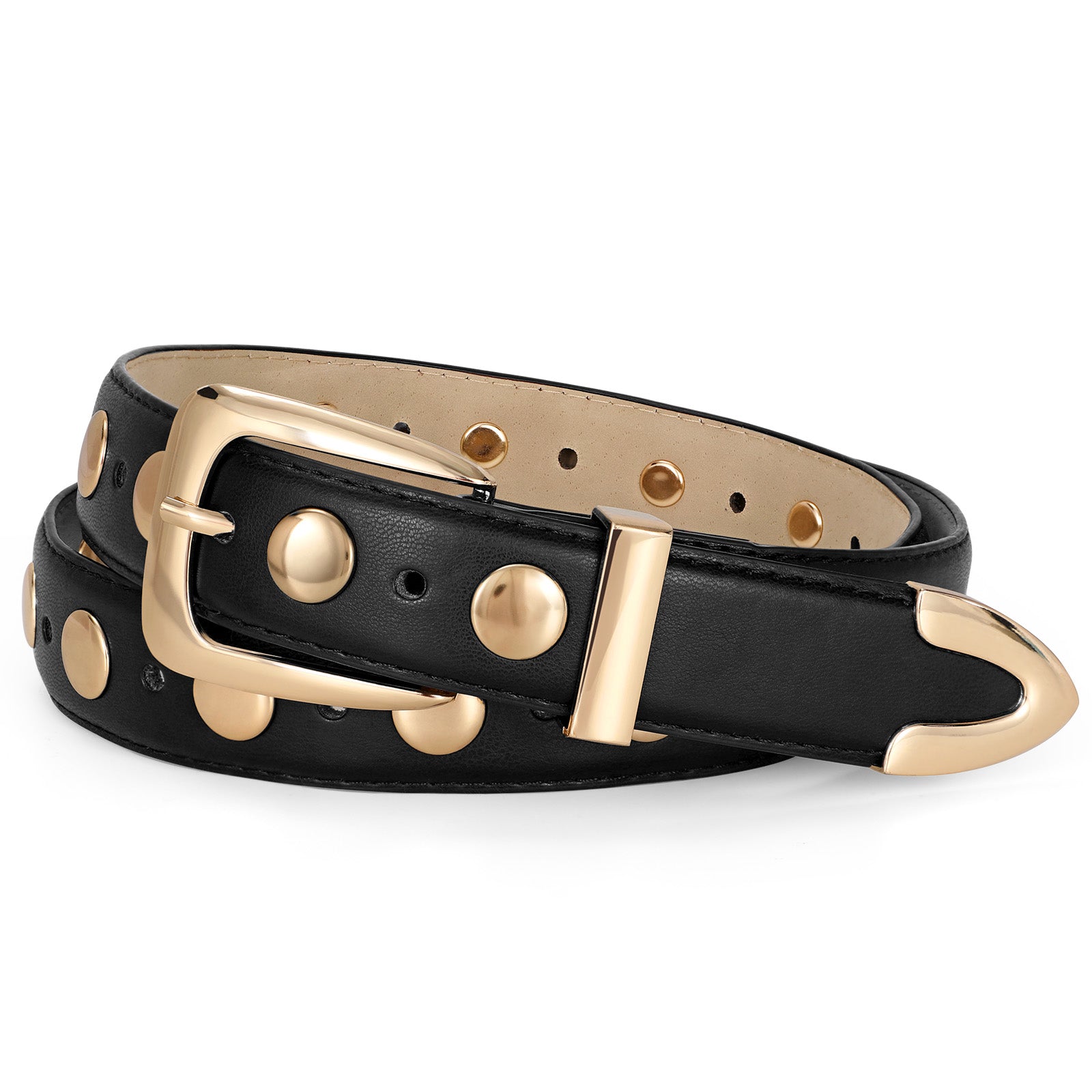 - Color and Size: Available in black/brown/coffee/white with gold/silver buckle. This women studded leather belt comes in 4 sizes to fit waist ranging from 27" to 46". Belt width:2.8cm/1.1”. This belt features hole along the whole belt, accommodating a wide range of body types and allowing for easy adjustment to fit most women waist size.